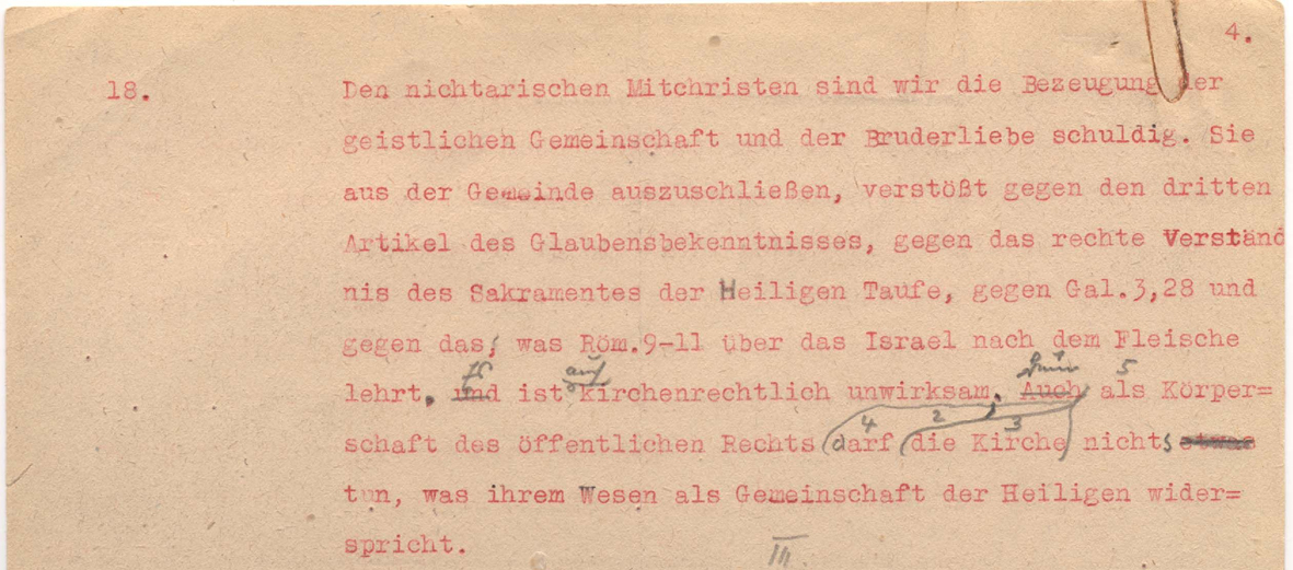 We owe it to non-Aryan fellow Christians to bear witness to spiritual communion and charity. Excluding them from our communion, violates the third article of the creed, the right understanding of the sacrament of holy baptism, Gal. 3:28 and what Rom 9–11 teaches about Israel according to the flesh. It is also invalid according to church law; for the church may not do anything as a statutory corporation that is inconsistent with its nature as a communion of saints. (Hermle, Thierfelder, Herausgefordert, 667)