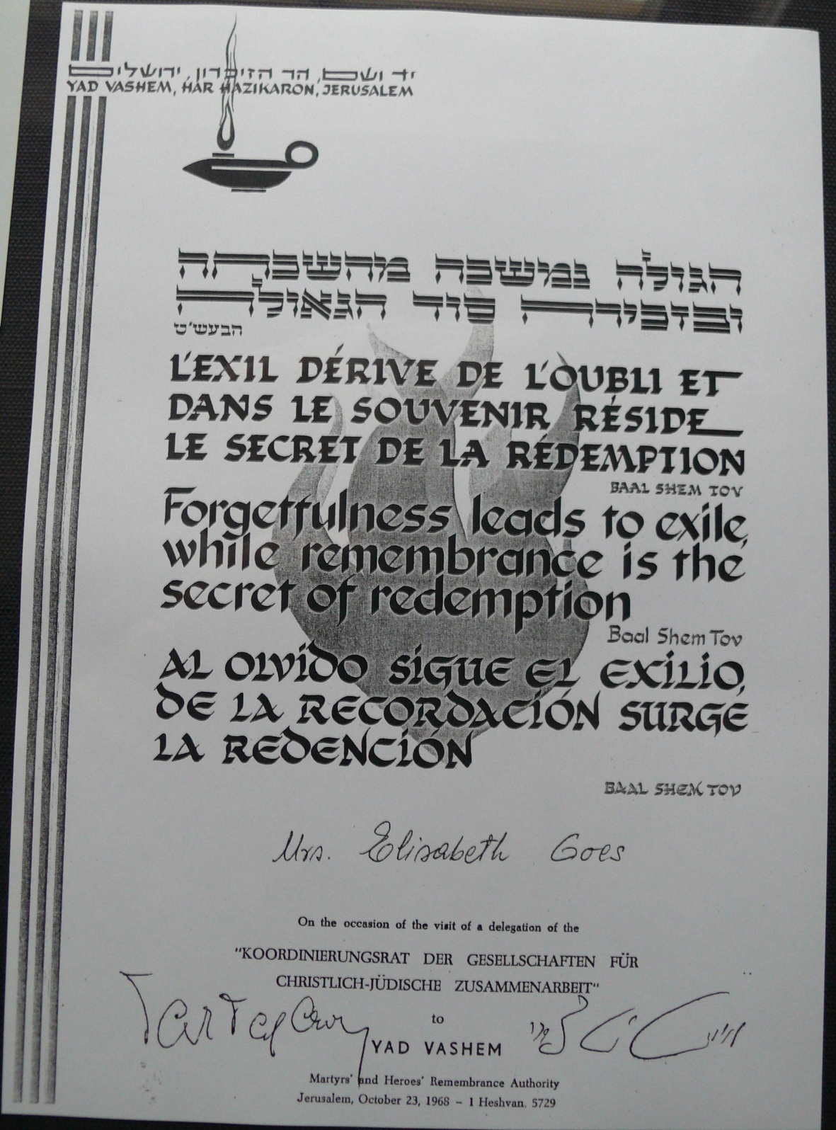 The Israeli envoy to Germany Avraham Benjamin honored Elisabeth Goes on June 1, 1995 in Augsburg with the title “Righteous Among the Nations” awarded by the state of Israel.