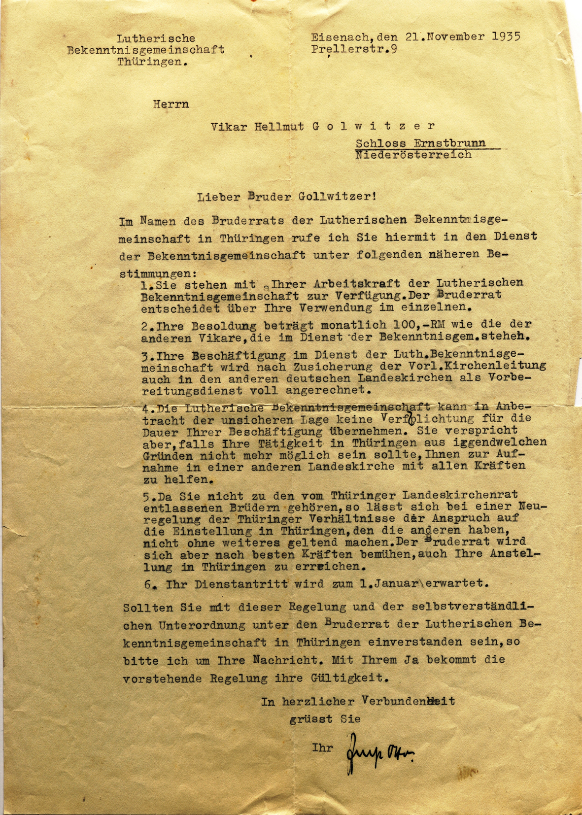 Gollwitzer started working for the Council of Brethren of the Lutheran Confessional Fellowship in Thuringia in January of 1936. He took over the Department of Evangelization.