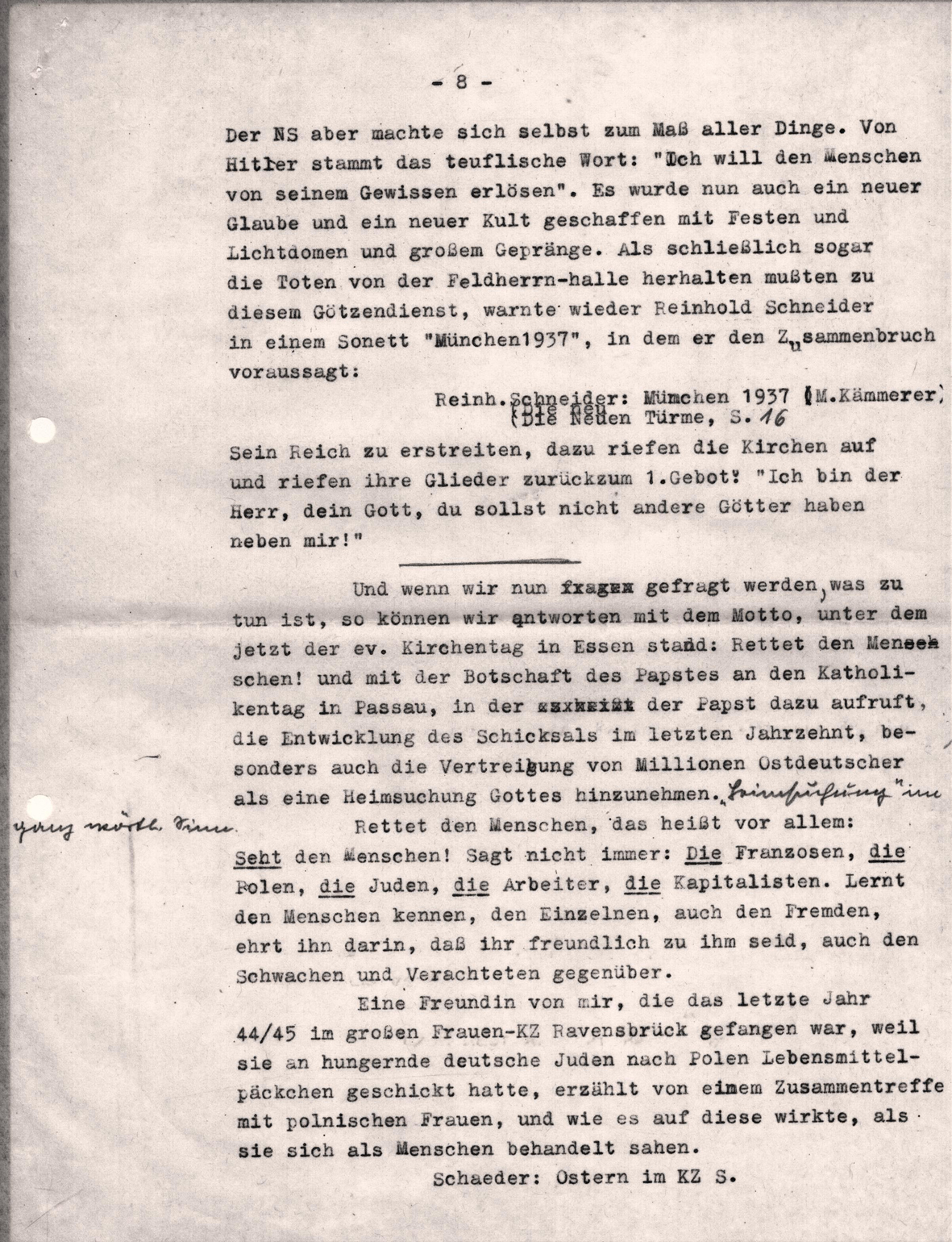 The teacher trusted in education to combat renewed undesirable developments in society. She thus openly mentioned German crimes in her speech and illustrated them with the fates of individuals. She also referred to individuals in the Christian resistance. For the future, Schmitz placed her hope in a Christian faith that was liberating.
