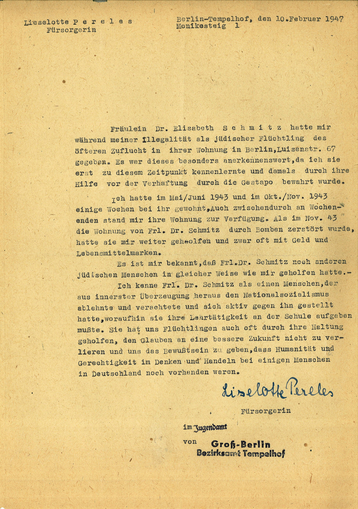 Elisabeth Schmitz had been involved in aiding Jews living in Berlin illegally since the beginning of the deportations. She repeatedly took in victims of persecution in her apartment and in a weekend house she had purchased from friends who had emigrated. She also helped them with money and food ration stamps.