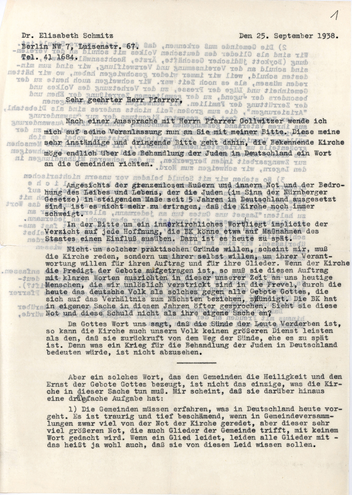 Vor dem Hintergrund der im September 1938 drohenden Kriegsgefahr schrieb Elisabeth Schmitz an den reformierten Pfarrer Wilhelm Niesel. Helmut Gollwitzer hatte ihr empfohlen, ihren Appell an dieses führende Mitglied der Bekennenden Kirche zu richten.