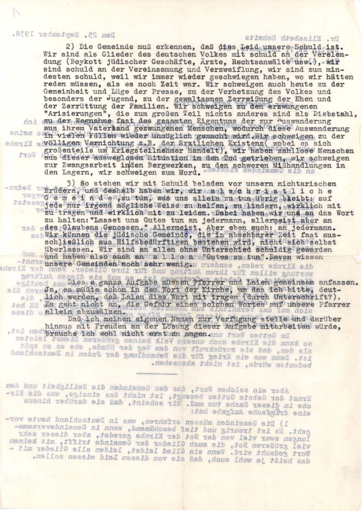 Ein solches Wort müsse notfalls auch durch Unterschriften bekräftigt werden. Sie selbst war zu einer Unterschrift bereit – wohl ahnend, dass dies zumindest ihre Entlassung aus dem Schuldienst bedeutet hätte. Auch forderte sie die christliche Gemeinde dazu auf, den Verfolgten christlichen und jüdischen Glaubens praktische Hilfe zu leisten.