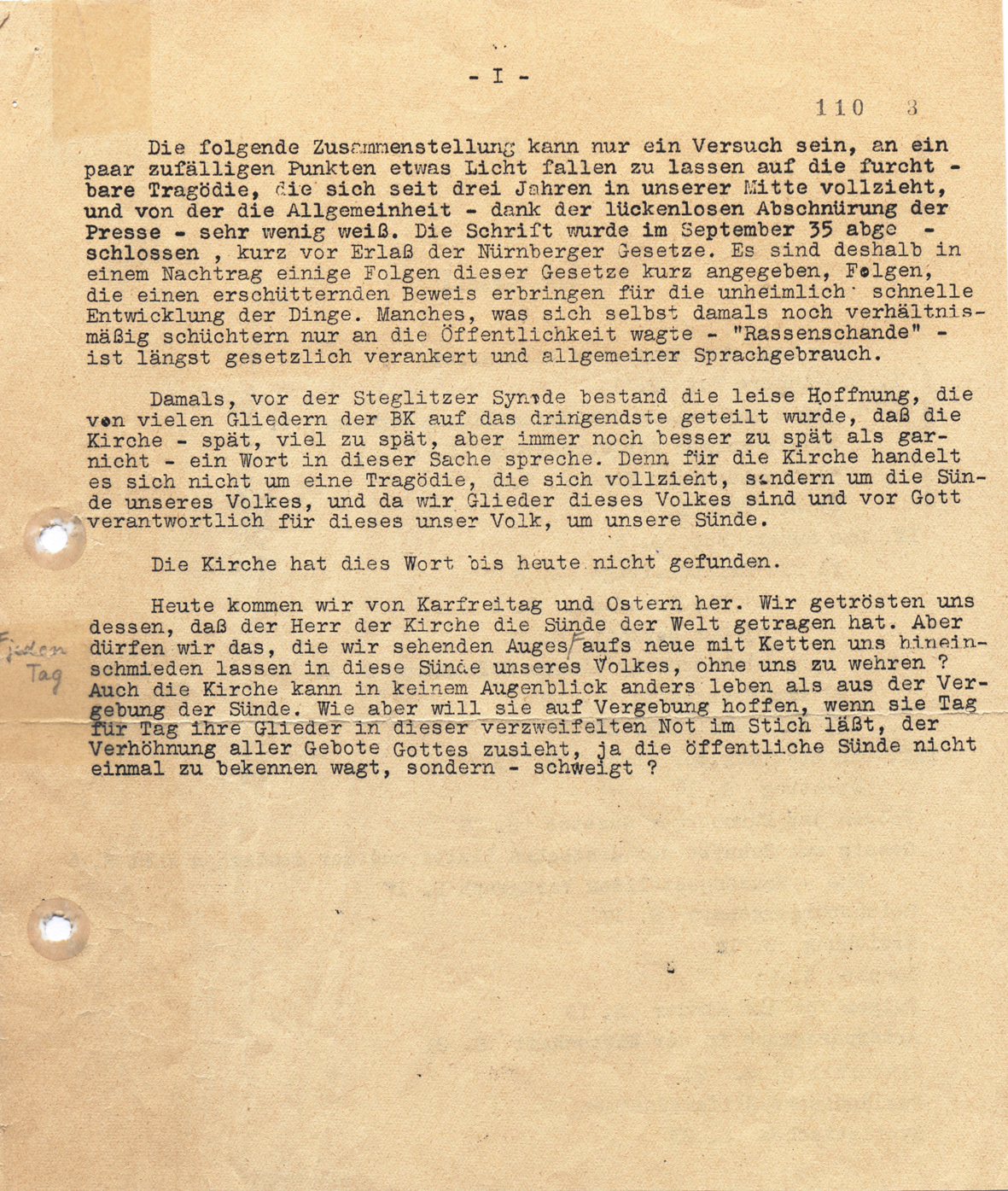 Schmitz’s anonymous text was arguably the most explicit protest within the Confessing Church against the persecution of Jews. Unlike Marga Meusel’s memorandum, the situation of all non-Aryan Germans and not just non-Aryan Christians mattered to her.
