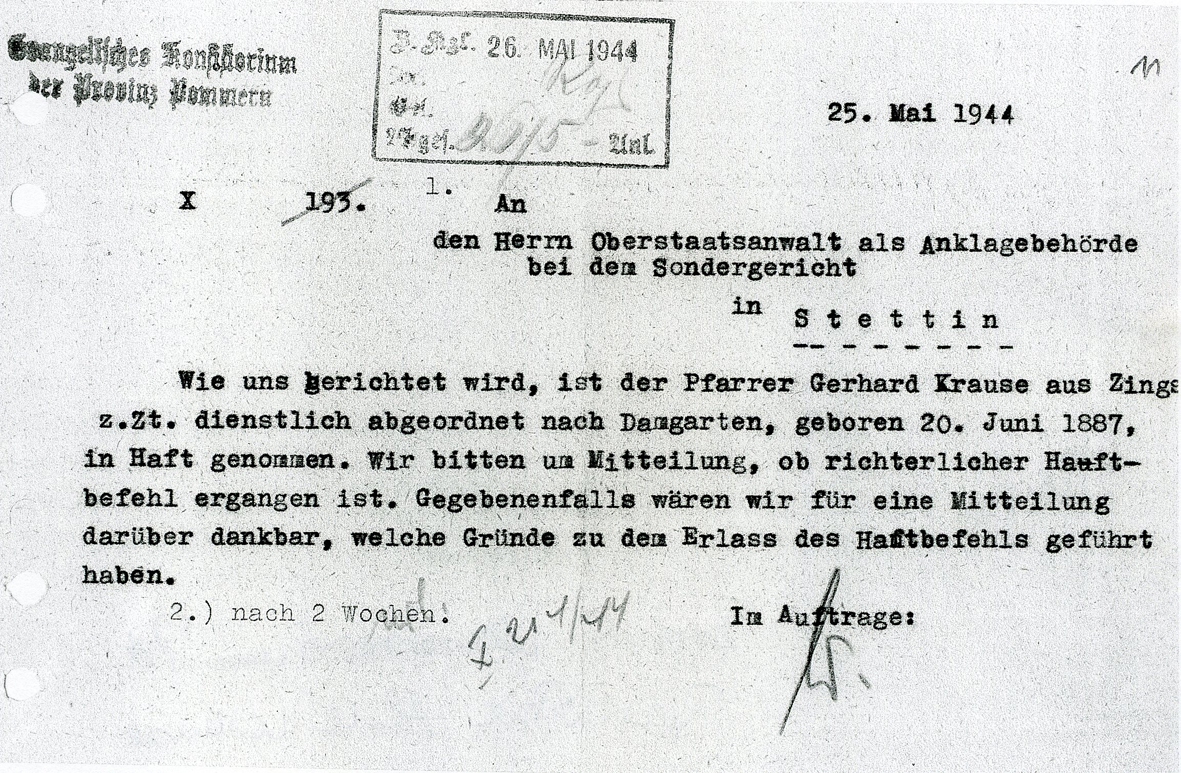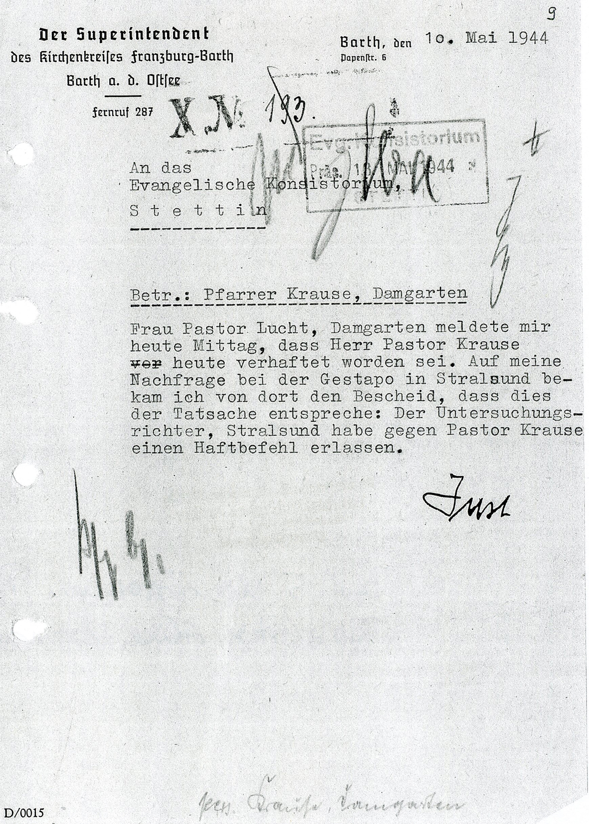 Four brief letters provide vivid insight into the dramatic events following Pastor Krause’s detention in May of 1944: Barth superintendent Just had informed the consistory of the Province of Pomerania in Stettin on May 10, 1944 about Pastor Krause’s arrest; he was unable to state any reasons for this action, though.