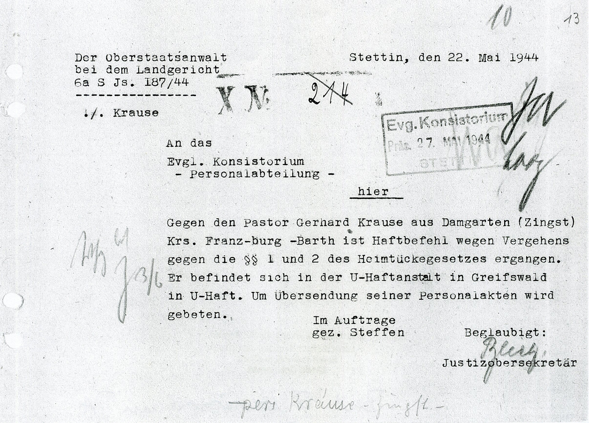 The Stettin district attorney asked the consistory on May 22 to forward Krause’s employee records since he had been taken into custody for an offence against the Treachery Act. Only at this point did the consistory request on May 25 to be informed of more precise grounds for issue of the arrest warrant.