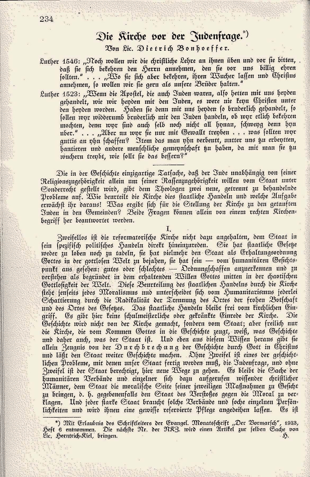 In der ersten Jahreshälfte 1933 äußerte sich Dietrich Bonhoeffer in Vorlesungen, Predigten und im Rundfunk immer wieder kritisch über die nationalsozialistische Gleichschaltung. Auf den „Arierparagraphen“ vom 7. April 1933 reagierte er sogleich mit dem Aufsatz Die Kirche vor der Judenfrage, der im Juni gedruckt wurde. Darin lehnte er nicht allein die Anwendung der antisemitischen Gesetzgebung auf die eigenen Kirchenmitglieder jüdischer Herkunft ab, sondern forderte darüber hinaus generelle Solidarität der Kirche mit den Opfern staatlicher Gewalt.
