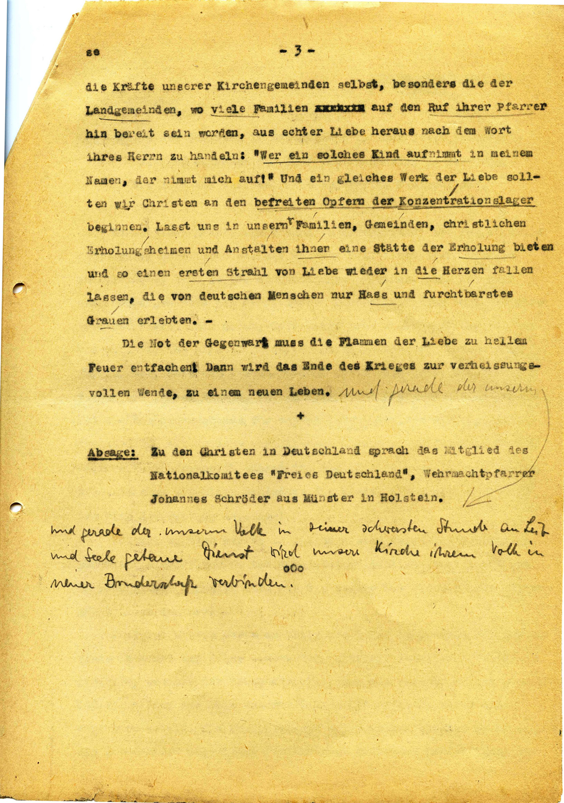 Schröder’s work for the National Committee for Free Germany continued even after May 8, 1945. In his radio sermons and addresses, he appealed to Christians to support the inner renewal of the German nation. They should help where they could and also devote themselves to the liberated victims of the concentration camps. German guilt could also not be evaded; the perpetrators had to be condemned.