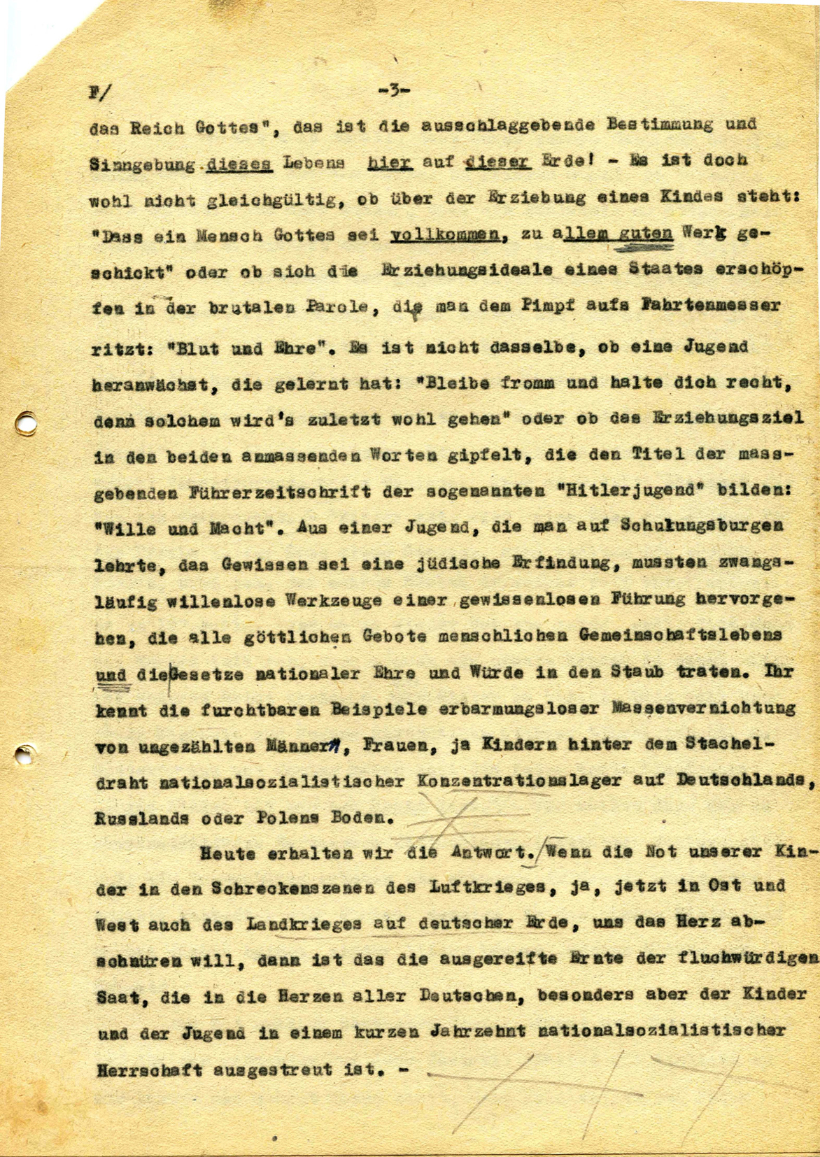 Following the liberation of the occupied territories and the first concentration camps, Schröder also dealt with the Nazis’ crimes. In a sermon from the end of October of 1944, he interpreted the collapse of civilization as the consequence of Nazi education and the bombing war as the mature fruit of this accursed seed.