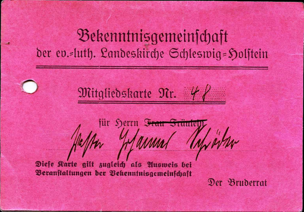 On October 19 and 20, 1934, Schröder attended the founding meeting of the Aid Association and Council of Pastors of Schleswig-Holsteinin in Rendsburg, which was the predecessor of Schleswig-Holstein’s Confessing Church. His membership card bore the number 48.