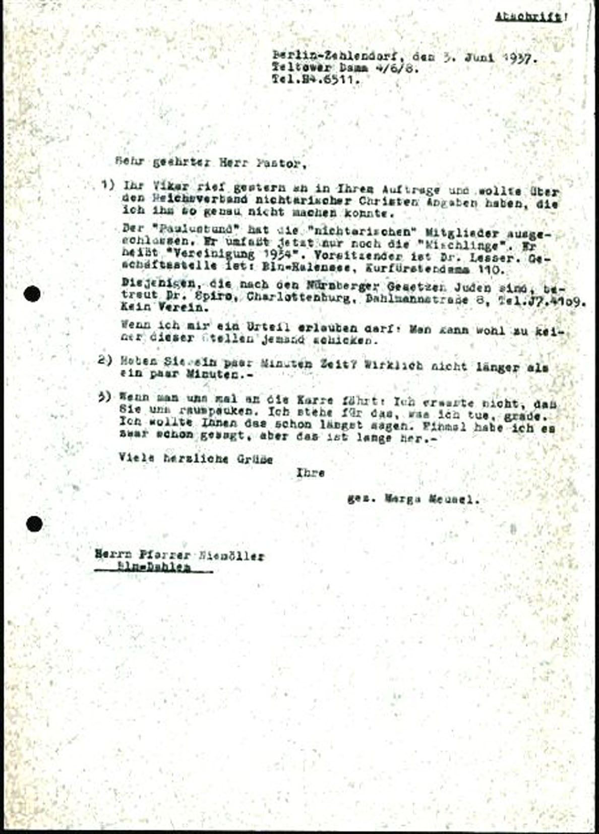 Marga Meusel was undeterred in her efforts to aid victims of racial persecution and was even willing to bear the possible consequences. On June 3, 1937, she wrote Martin Niemöller, the chairman of the administrative committee des Protestant district welfare agency, If we run into trouble at some point: I do not expect you to bail us out. I will answer for what I am doing.