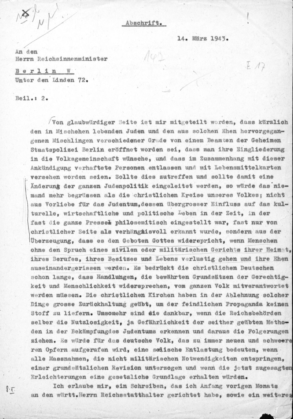 Making reference to a change in the treatment of “mixed marriages” reputedly becoming observable in Berlin, Wurm demanded in a letter to Reich Minister of the Interior Frick a general reorientation of the entire Jewish policy.