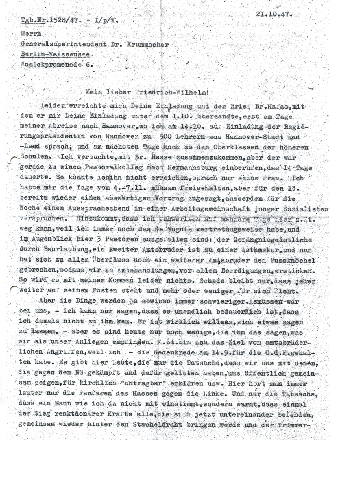 His fellow clergy attacked him in October of 1947 because he had given a speech on the “Day of Remembrance for the Victims of Fascism”, the second Sunday in September. The Berlin city council had resolved in 1945 to observe such a day of remembrance. At first, it was largely organized to be nonpartisan, nondenominational and pan-German. From 1948 onward, the idea split into in East and West however in the course of the Cold War. The “Association of Victims of Persecution by the Nazi Regime” (VVN) sponsored the day of remembrance as of 1947.
