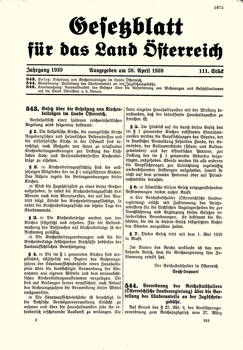 - Gesetzblatt für das Land Österreich vom 28.4.1939; © Österreichische Nationalbibliothek, Wien