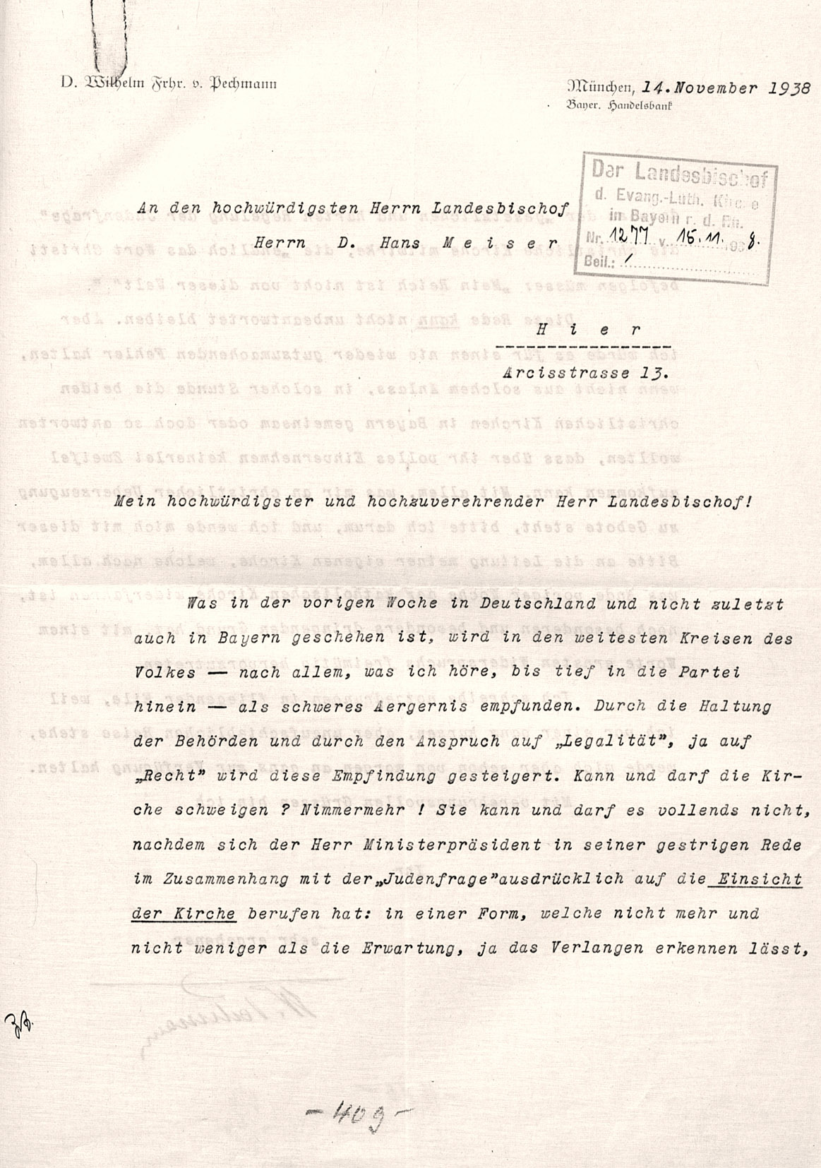 A few days after the November Pogrom, Wilhelm Freiherr von Pechmann turned to Regional Bishop Hans Meiser (1881–1956) in a letter of November 14, 1938. Von Pechmann felt that the period of the church to remain silent had passed and the time for a collective protest from the church had arrived. Not only the acts of violence themselves but also Minister President Ludwig Siebert’s (1874–1942) appeal to the church’s discernment in the so-called Jewish Question and the attack on Cardinal Michael von Faulhaber’s (1869–1952) residence in Munich in the evening of November 11, 1938 prompted von Pechmann to take this step.