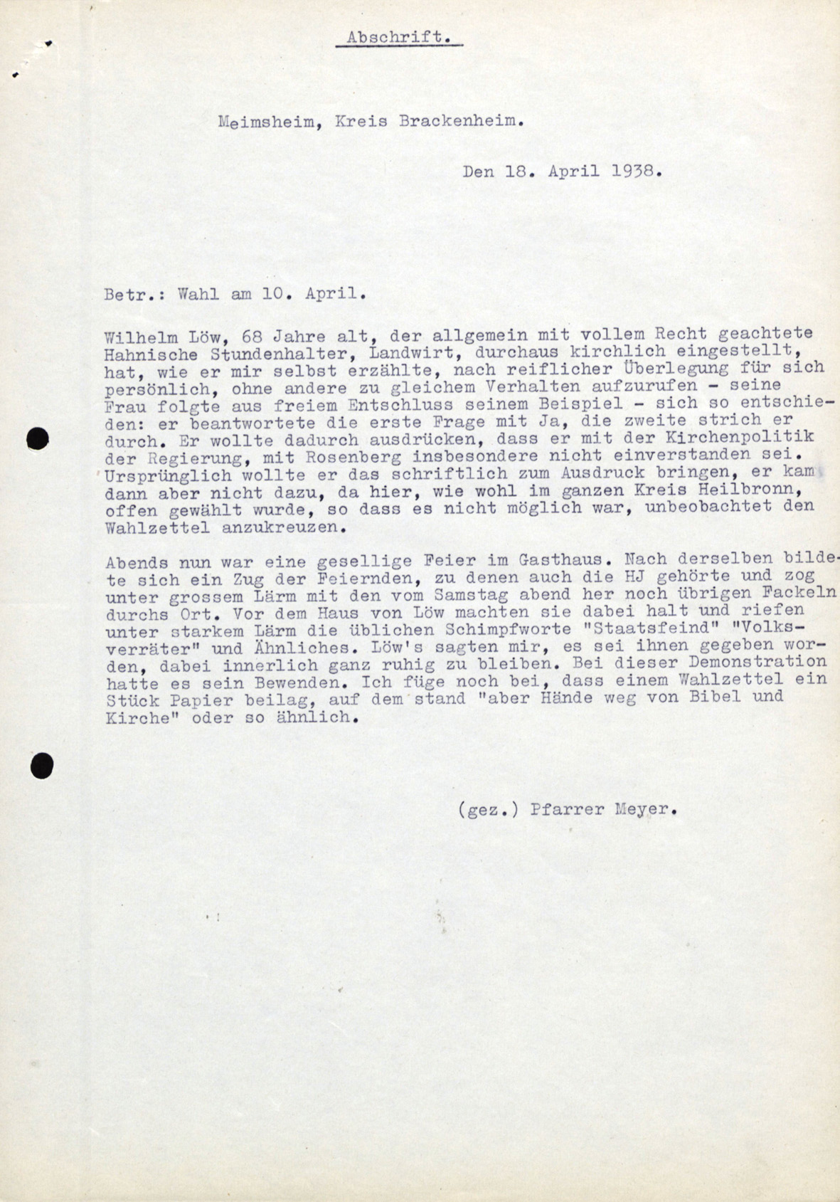 In Meimsheim beantworteten der örtliche Leiter der Hahn’schen Stunde und seine Frau die erste Frage zum Anschluss Österreichs mit JA, strichen die zweite aber durch. Sie wollten damit ihren Protest gegen die Kirchenpolitik der Regierung, mit Rosenberg insbesondere, zum Ausdruck bringen (G. Schäfer, Dokumentation 5, 925). Noch am selben Tag formierte sich ein Fackelzug, der vor dem Haus der Familie die üblichen Schimpfworte ‚Staatsfeind‘, ‚Volksverräter‘ und ähnliches anstimmte (G. Schäfer, Dokumentation 5, 926).
