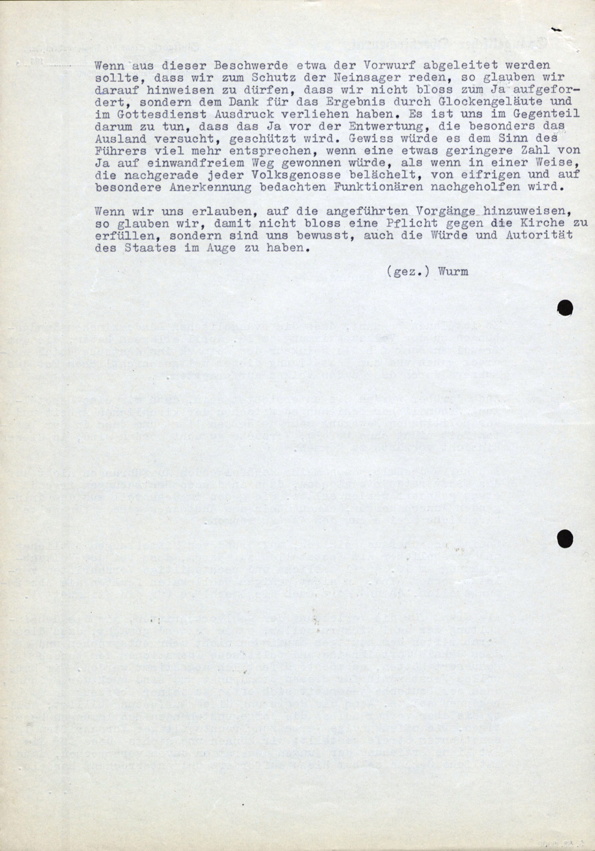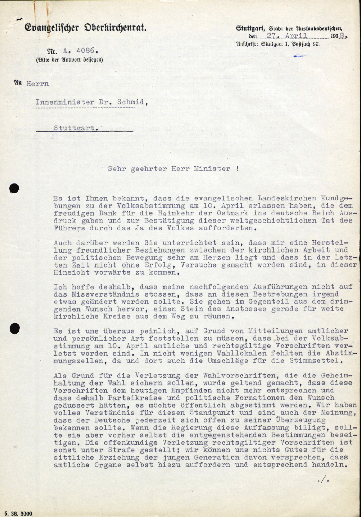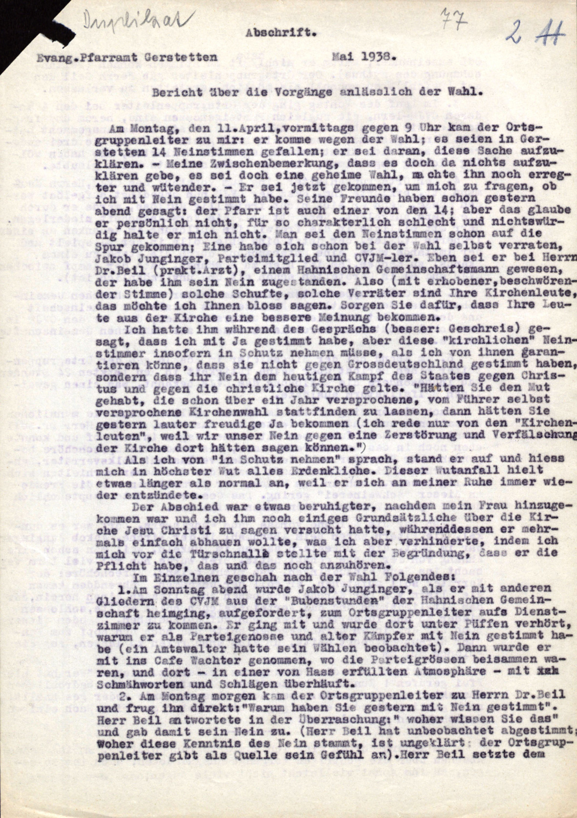Die propagandistisch groß herausgestellte Volksabstimmung vom 30. April 1938 veranlasste auch den Evangelischen Oberkirchenrat Stuttgart, die Pfarrer anzuweisen, am Wahltag im Schlussgebet folgende Passage aufzunehmen: