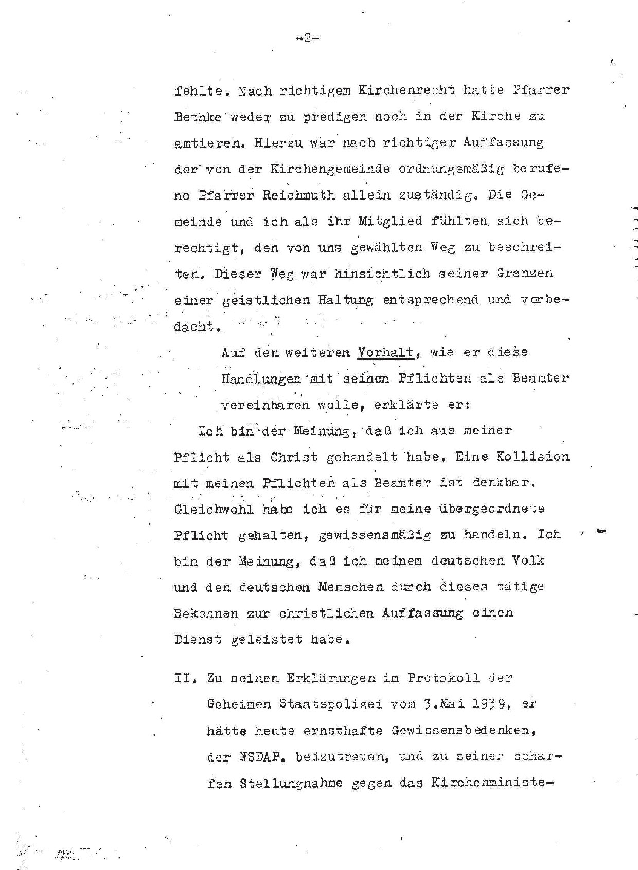 In der Stadt Brandenburg hatten sich die staatshörigen „Deutschen Christen“ nur auf dem Dom einnisten können. Die übrigen Gemeinden waren – mit Nuancen Unterschied – im märkisch-altpreußischen Stil bekenntnistreu. Im Frühjahr 1939 griff das etablierte Kirchenregiment von Berlin aus ein und entsandte einen kommissarischen Superintendenten deutsch-christlicher Färbung an die Gotthardt-Gemeinde. Als er am 23.04. dort das erste Mal Gottesdienst halten wollte, trat ihm der Kreisbruderrat vor dem Altar entgegen. Ich als Vorsitzender erklärte ihm, dass die Gemeinde seinem Vorhaben widerspreche. Unterdessen bestieg der rechtmäßige Gemeindepfarrer Tecklenburg die Kanzel. Unter seiner Leitung begann und endete der Gottesdienst. Als sich am darauf folgenden Sonntag dieser Introitus wiederholen sollte, war der Usurpator besser gerüstet. Als ich meine Anrede begann, trat auf seinen Wink ein Mann hinter ihm vor, zeigte seinen Ausweis als Beamter der Geheimen Staatspolizei und verhaftete mich. Dasselbe geschah mit meinem Vertreter, Studienrat Lindner, der sofort an meine Stelle getreten war. Nun bestieg Herr Bethke, so hieß der kommissarische Superintendent, die Kanzel, konnte aber nicht zu Wort kommen, weil die Orgel einfiel und die Gemeinde unentwegt sang. Von draußen, wo ich unterdessen vernommen wurde, hörte sich das so chaotisch an, dass ich die Weisung hereinschickte, die Kirche zu verlassen. (Zitiert nach: Döring, Kreyssig, S. 116)