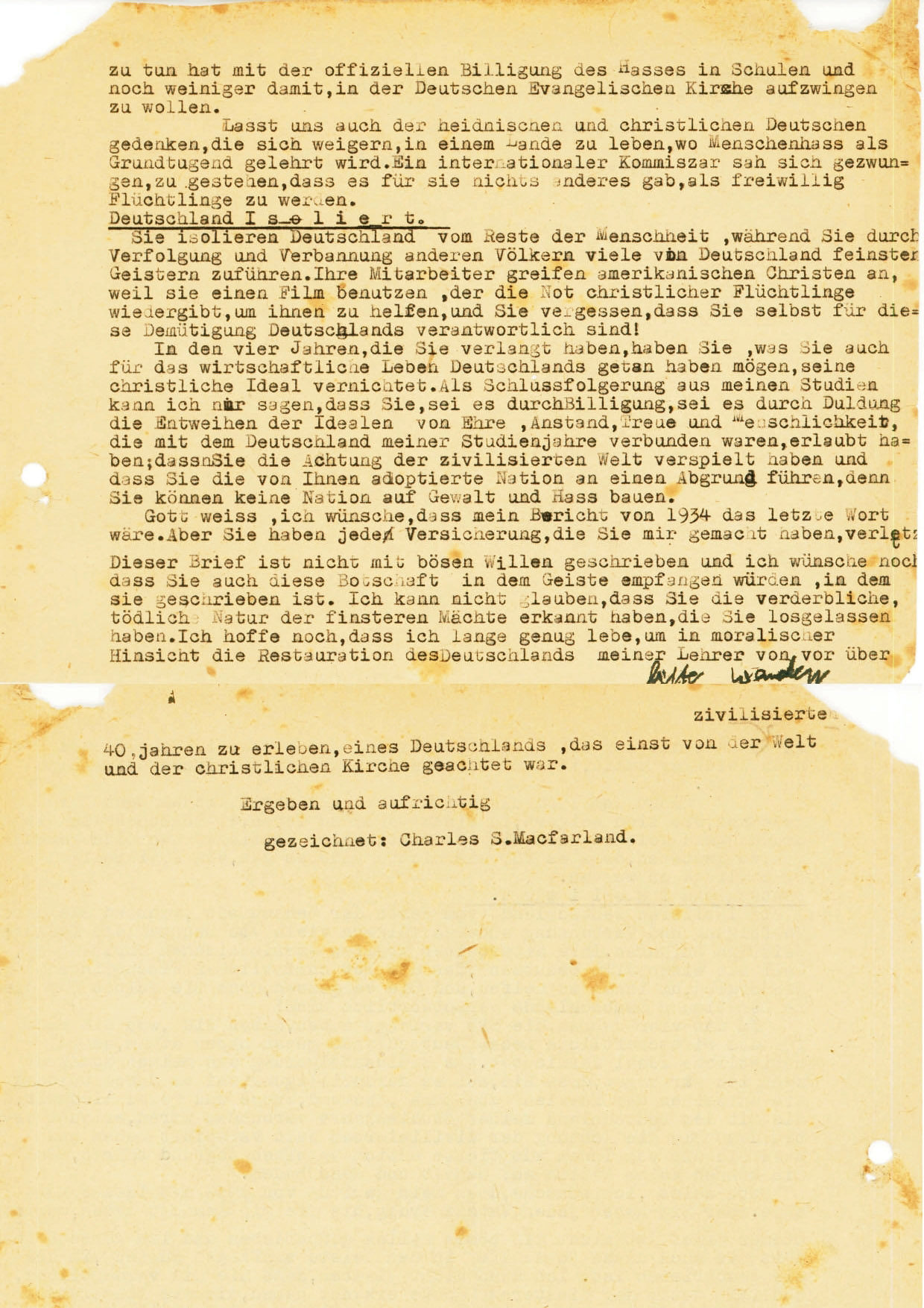 Charles MacFarlands Protestbrief an Hitler