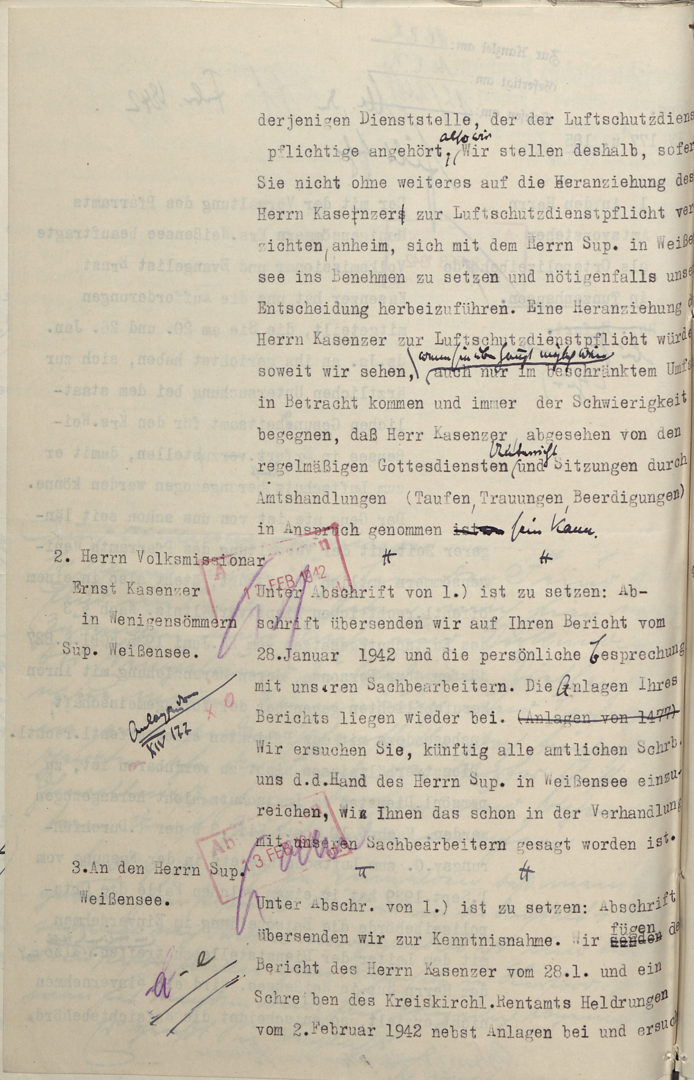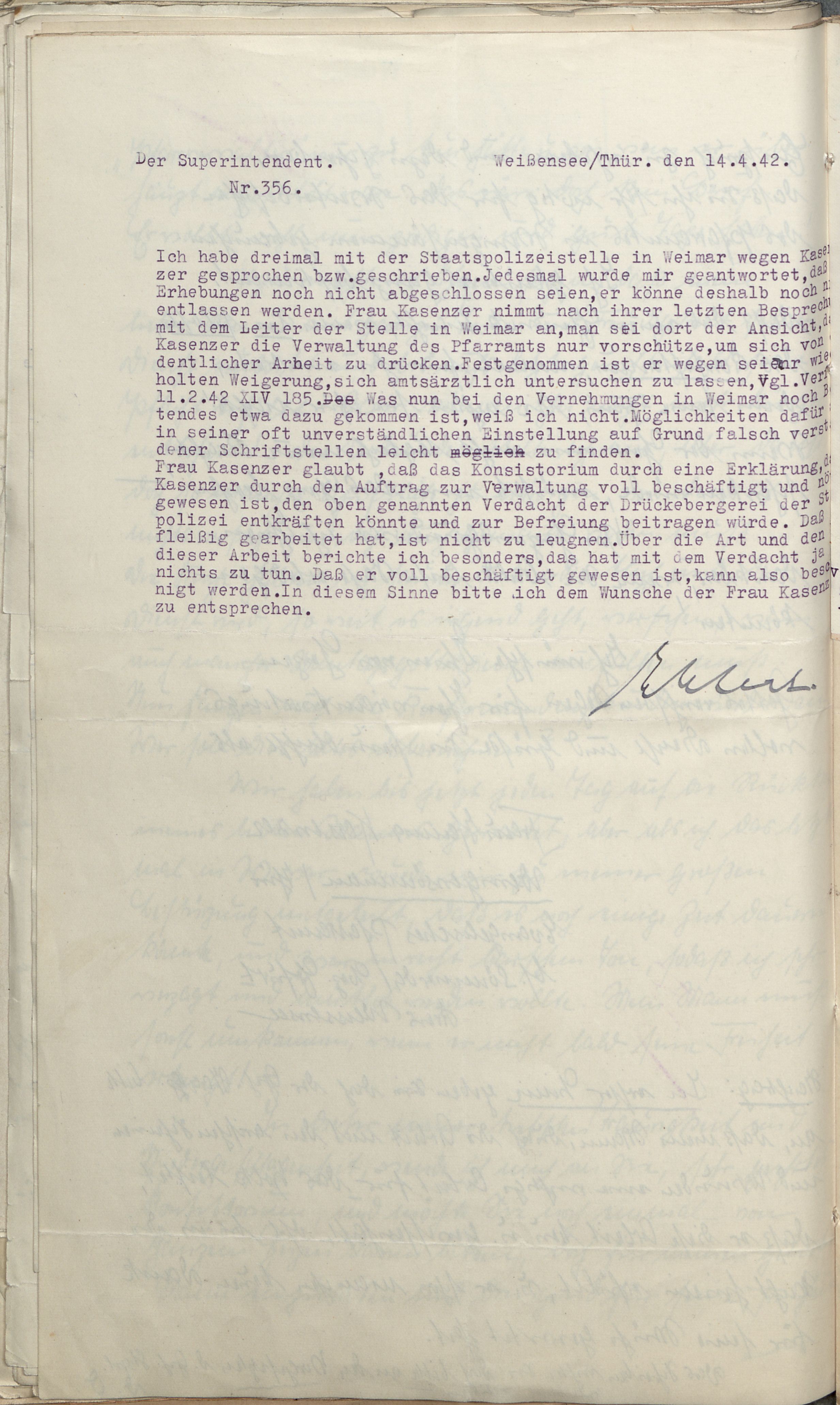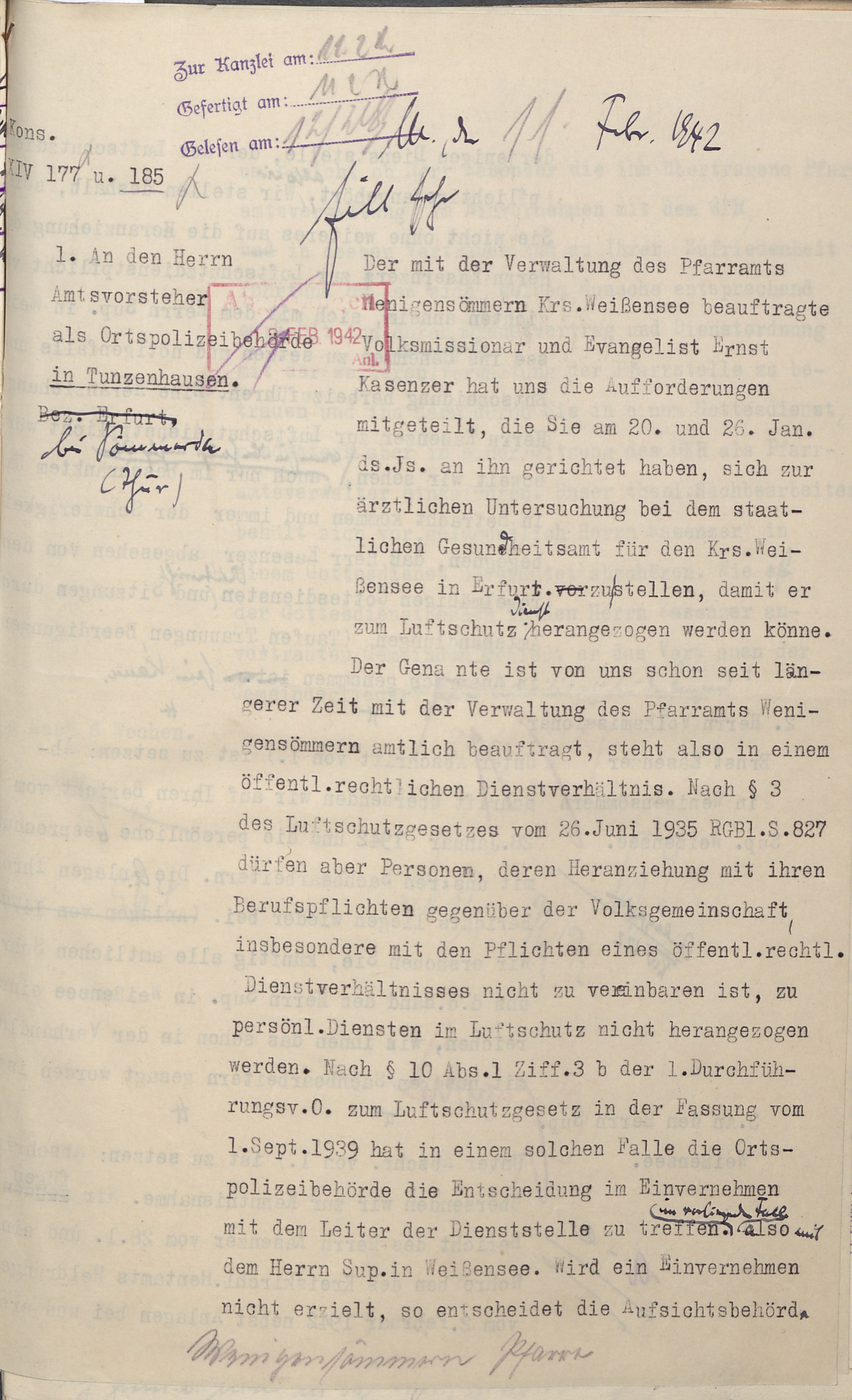 Am 5. März 1942 wurde der Volksmissionar Ernst Kasenzer in Wenigensömmern (Krs. Weißensee, nördlich von Erfurt) verhaftet und in das Polizeigefängnis Weimar verbracht. Begründet wurde die Verhaftung mit der Weigerung Kasenzers, sich für die Einsatzfähigkeit im Luftschutz amtsärztlich untersuchen zu lassen. Wegen seiner Beauftragung mit pfarramtlichen Diensten wäre eine Freistellung von dem Luftschutzeinsatz üblich gewesen. Das Konsistorium der Kirchenprovinz Sachsen in Magdeburg sandte deshalb bereits am 11. Februar 1942 ein Schreiben an die Polizeidienststelle in Wenigensömmern mit der Klarstellung der Rechtslage. Ausdrücklich wurde vom Konsistorium bescheinigt, dass Kasenzer in einem öffentlich-rechtlichen Dienstverhältnis stehe. Dies wurde aber von der Gestapo nicht akzeptiert, Kasenzer wurde trotzdem verhaftet. Seine Ehefrau intervenierte in Weimar: Als ich bei der Gestapo Weimar inständig um Freilassung meines Mannes bat und ich fragte, weshalb man ihn verhaftet hätte, wurde mir gesagt: „Ihr Mann hat nichts verbrochen, er soll sich bloß ändern, durch seine Einstellung verführt er die Umwelt“ (Daniel Bredt, Text zur Stolpersteinverlegung, zit. nach schriftlicher Auskunft von Dankwardt Bredt vom 17. März 2012). Das stärkt die Vermutung, dass er in Wirklichkeit wegen der Verweigerung des Hitlergrußes inhaftiert wurde. Superintendent Wilhelm Ehlert hat sich mehrfach bei der Gestapo in Weimar für die Freilassung Kasenzers eingesetzt – ohne Erfolg. Daraufhin wurde die Beauftragung mit pfarramtlichen Diensten in Wenigensömmern zum 31. Mai 1942 aufgehoben. Noch in seinen letzten Worten an seine Frau beteuerte Kasenzer: Für meinen Herrn und Heiland lass ich mir den Kopf abschlagen. Ich unterschreibe nichts (C. Nicolaisen, Kasenzer, 339).